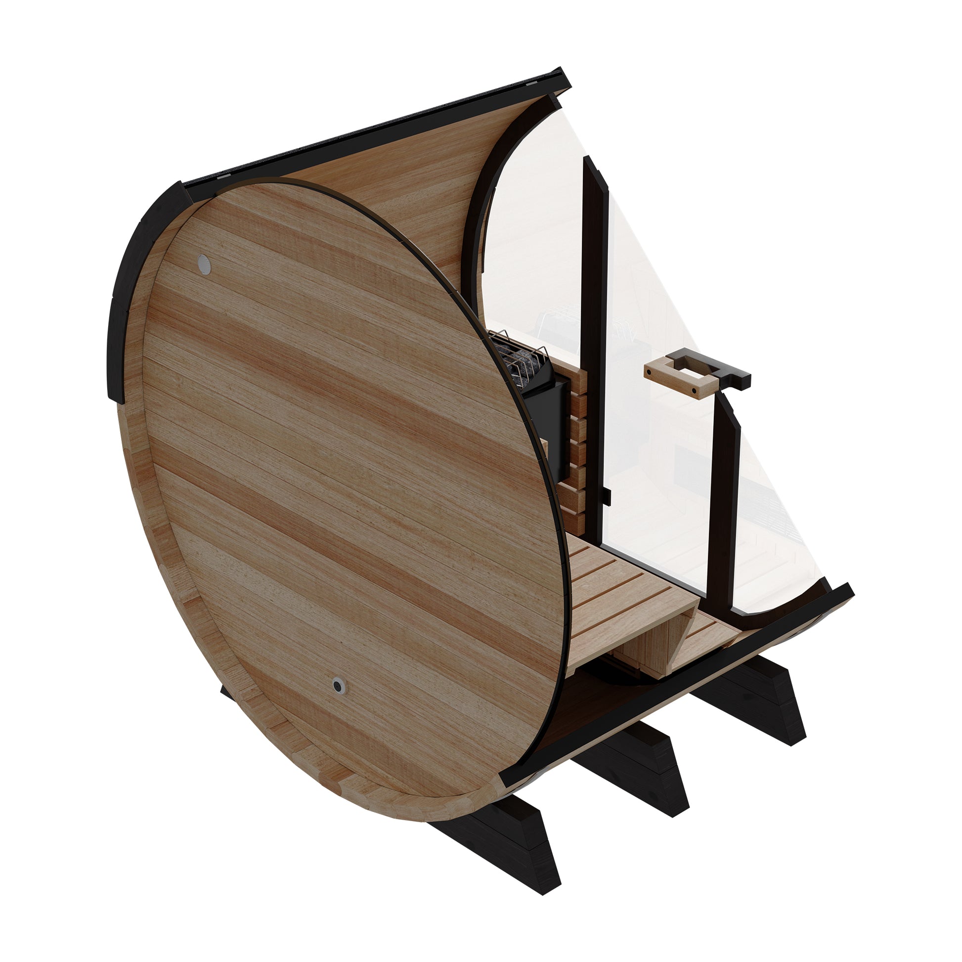 An 8 mm-thick tempered glass door and window panels create an open, upscale aesthetic while providing lasting strength. A complete shingle kit ensures your sauna stays dry and protected, no matter the weather.