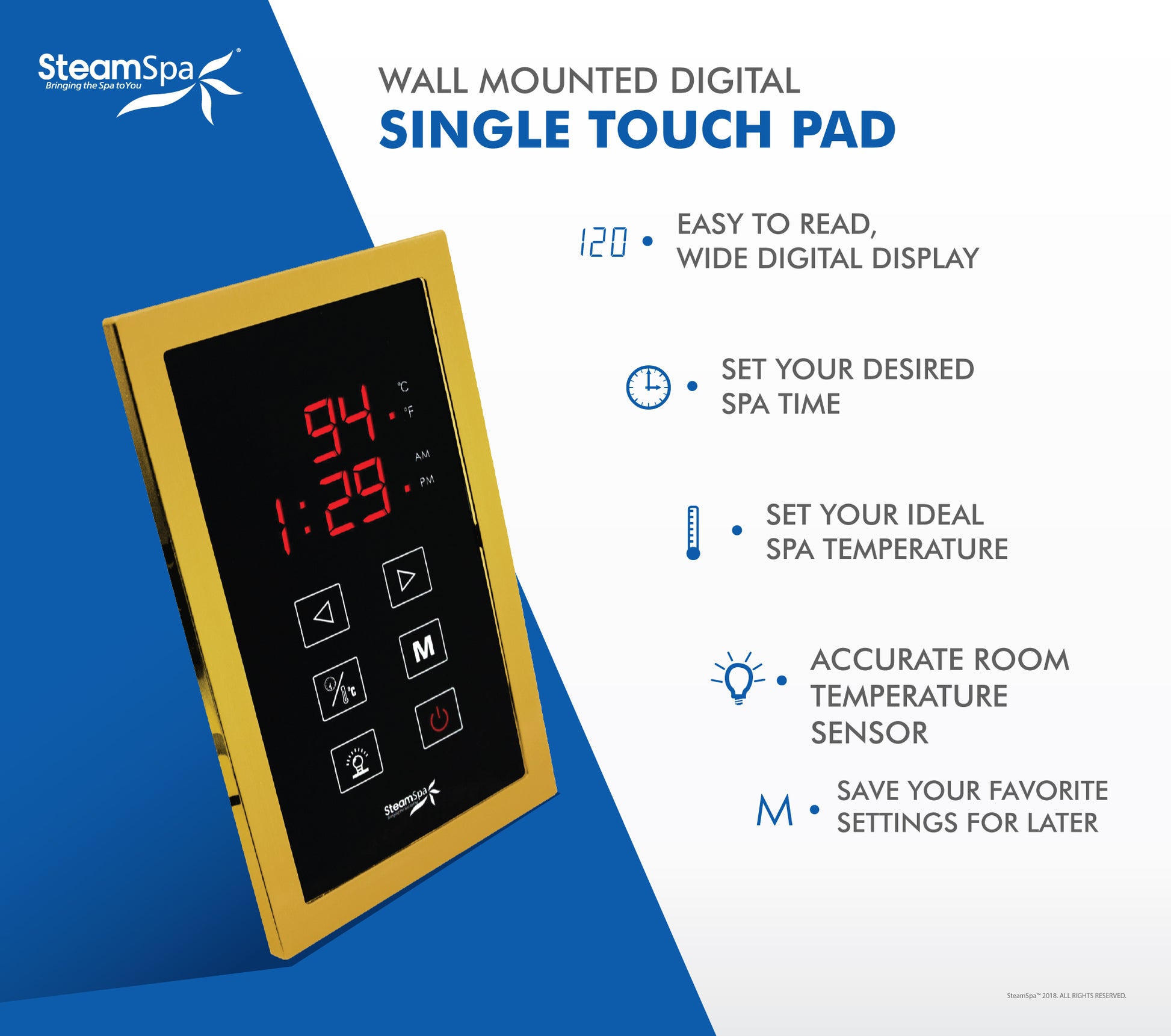 The control panel is the primary input device for any SteamSpa steam generator. With a large LCD display and simple to use interface the control panel allows access to room temperature controls and time setting options for your generator. With a stylish design it will match with most any bathroom style or décor adding to an overall luxurious sauna atmosphere. Take control of your ideal sauna experience with this stylish control panel and create the steam sauna experience that’s perfect for you.