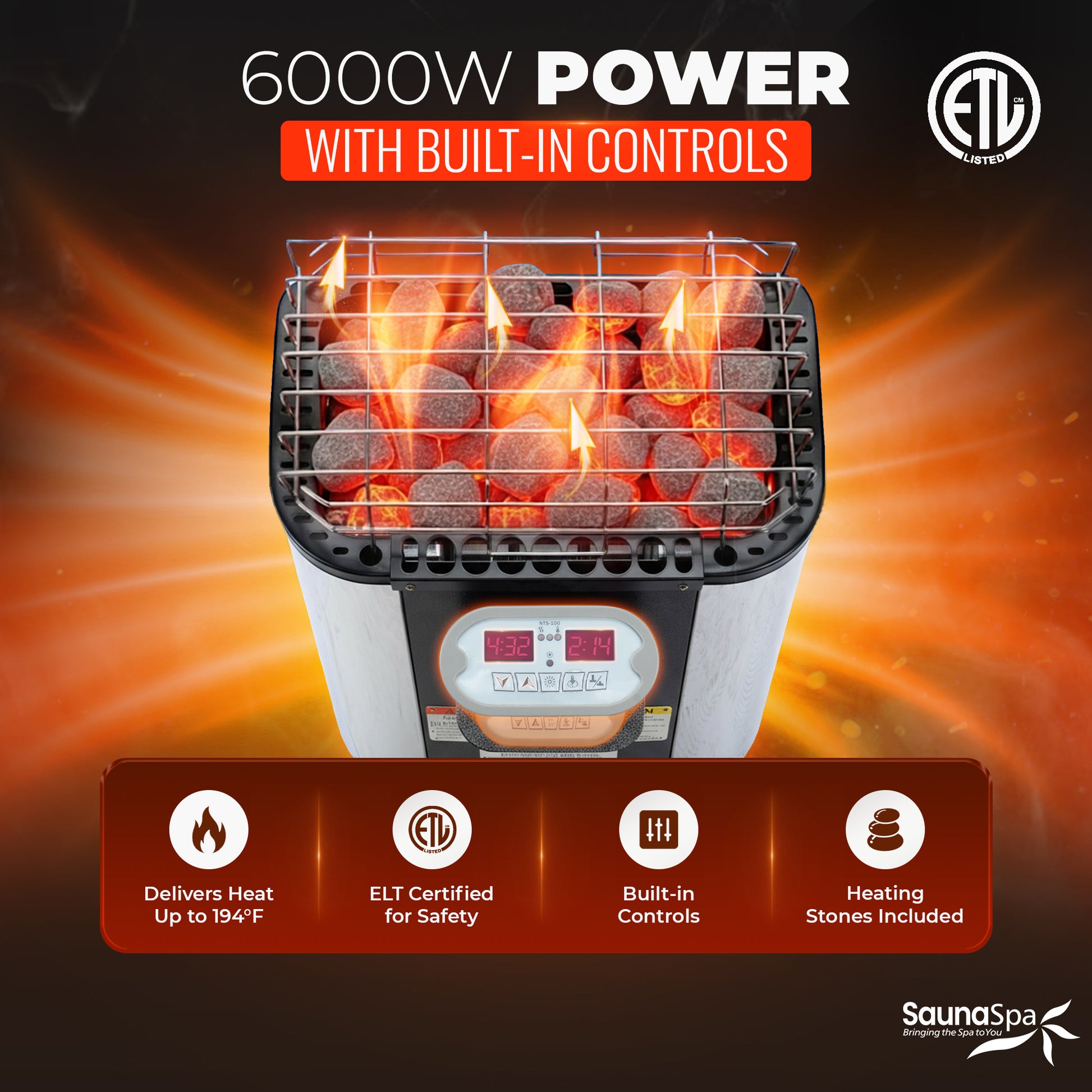 • 6.2KW SAUNA HEATER: ETL certificated 6.2KW sauna rock heater, heat up to 194F (set temperature: 158F-194F)