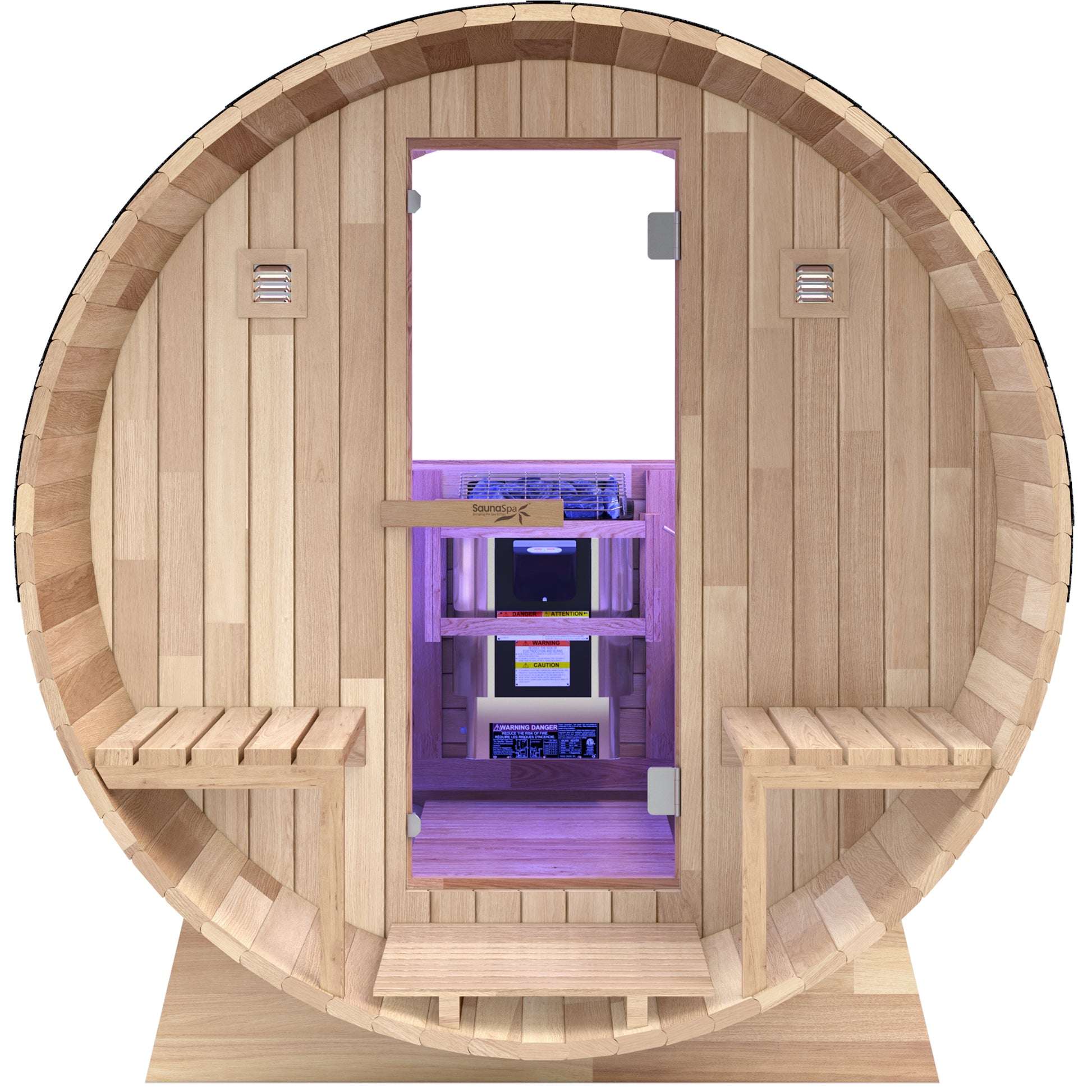 Create a serene backyard retreat with the SaunaSpa 4–6 Person Outdoor Barrel Sauna. Crafted from sustainably sourced 1.5" thick white cedar, it features an ETL-certified 6.2kW sauna rock heater delivering steady warmth up to 194F. Enjoy the front porch canopy, panoramic views, and chromotherapy lights. Bitumen shingles protect against rain and UV damage. Complete with an 8" clear tempered glass door with self-closing hinges and full accessories, this sauna delivers spa-level relaxation at home.